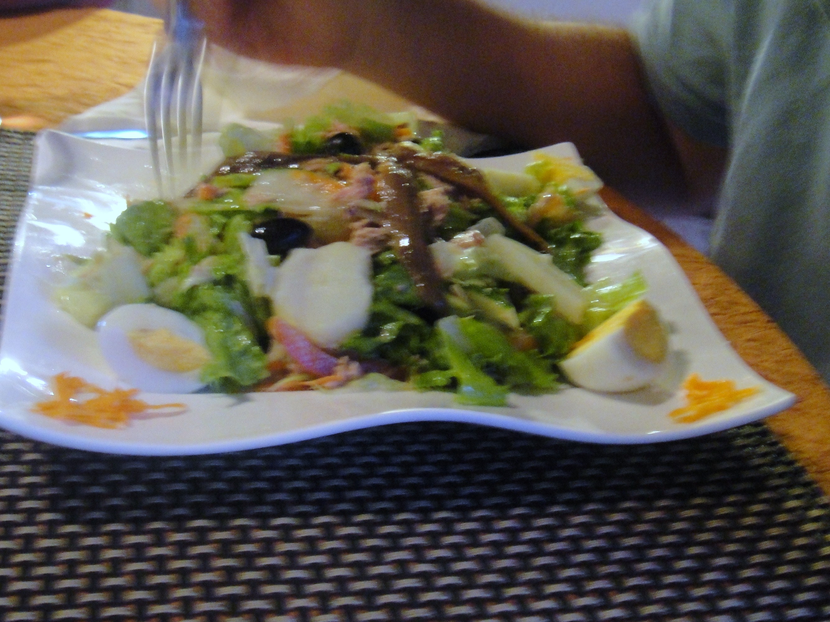 Existen muchas versiones de esta ensalada francesa provenzal, la que sirven en Bora Bora en un mini restaurante llamado La Bounty es perfecta, tiene los ingredientes clasicos que son lechuga, tomate, huevos, anchoas, y aceitunas negras. Esta version es servida con atun, pimiento verde, rebanadas de papa, aderezo de aceite de oliva; y adornado primorosamente en un plato, que sirve para una substanciosa racion, es un platillo completo.